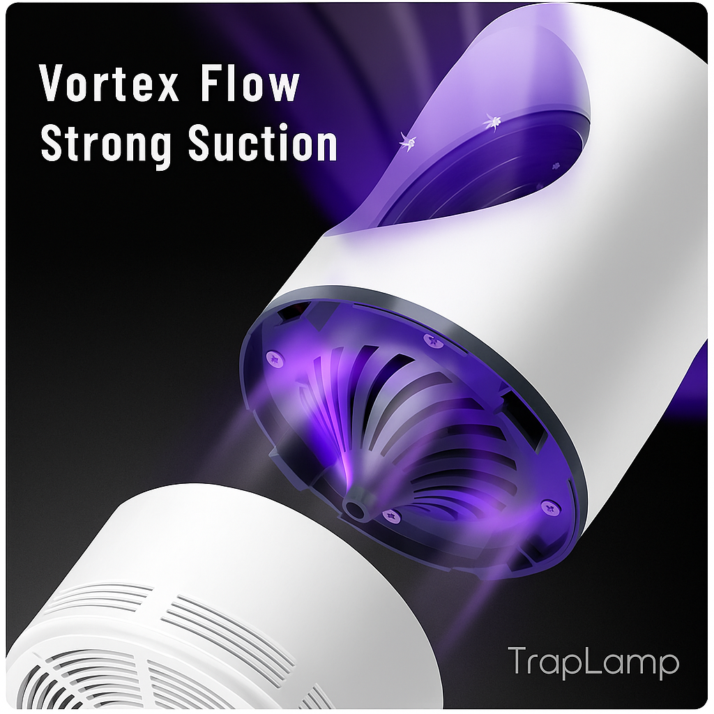 TrapLamp uses UV LED light to attract mosquitoes and insects. Once they get close, a powerful yet silent fan pulls them inside, trapping them in a chamber where they dehydrate naturally — all without chemicals, noise, or odors.